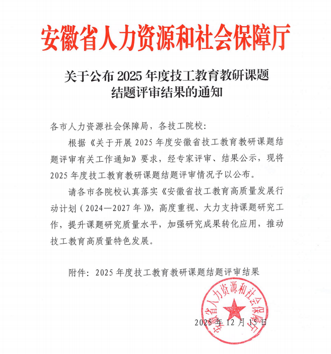 近日,安徽省人力资源和社会保障厅公布了2025年度技工教育教研课题结题评审结果。芜湖建康高级技工学校再获4项省级教研课题结项,再次实现结项率100%。课题内容涵盖专业课程建设、学生素养培育、技能竞赛赋能、文化育人融合四大核心领域,集中彰显了学校在教科研领域的较高水平和过硬实力。