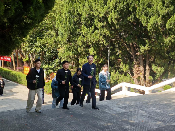 默哀结束后,师生代表手持洁白菊花,依次缓步走向纪念碑,将鲜花轻轻放在碑前,鞠躬致敬。随后,全体党员面向党旗重温入党誓词,团员青年重温入团誓词,铿锵有力的誓言回荡在陵园上空,既是对先烈的深情告慰,更是传承遗志、勇担使命的庄严承诺。