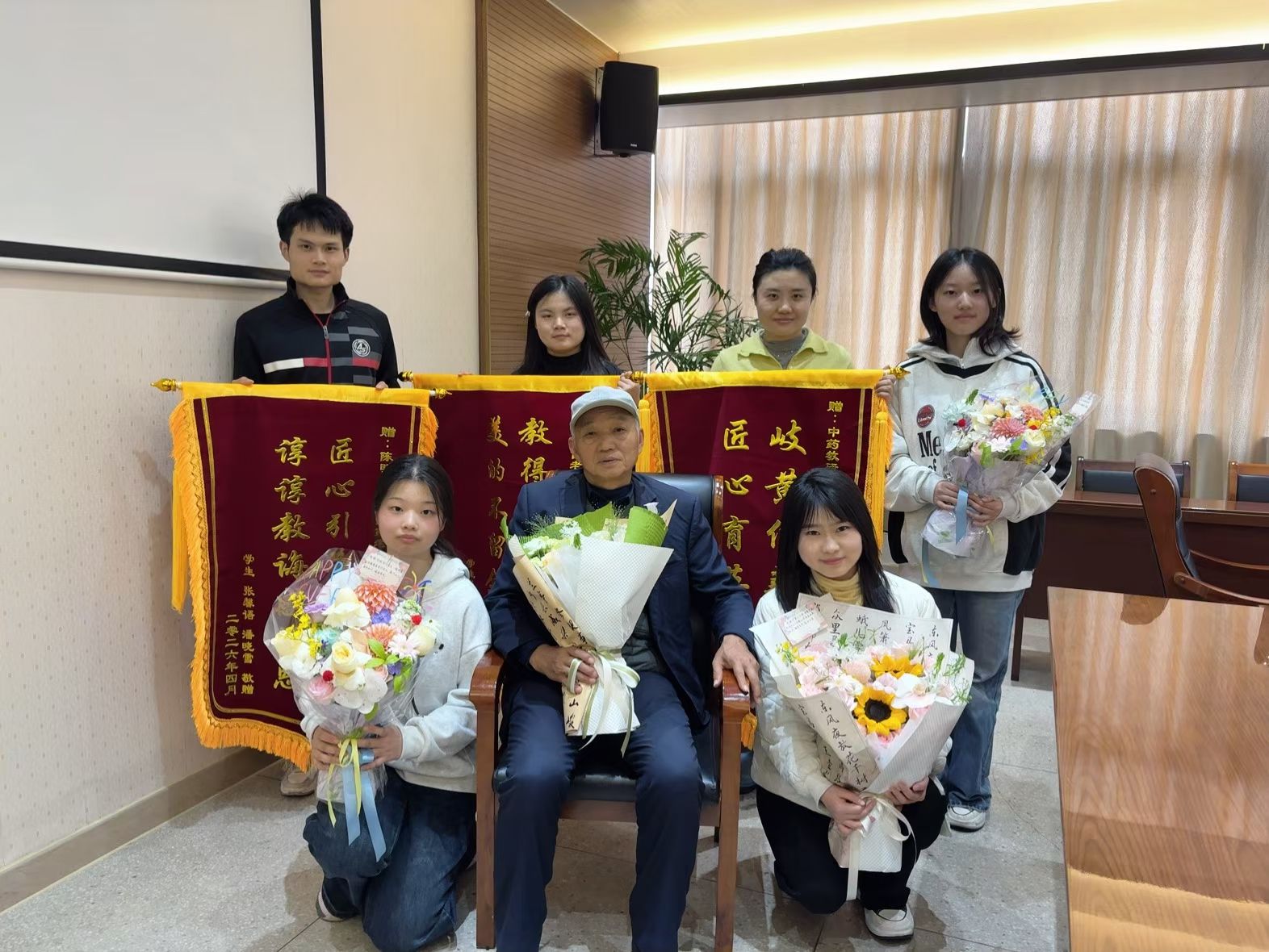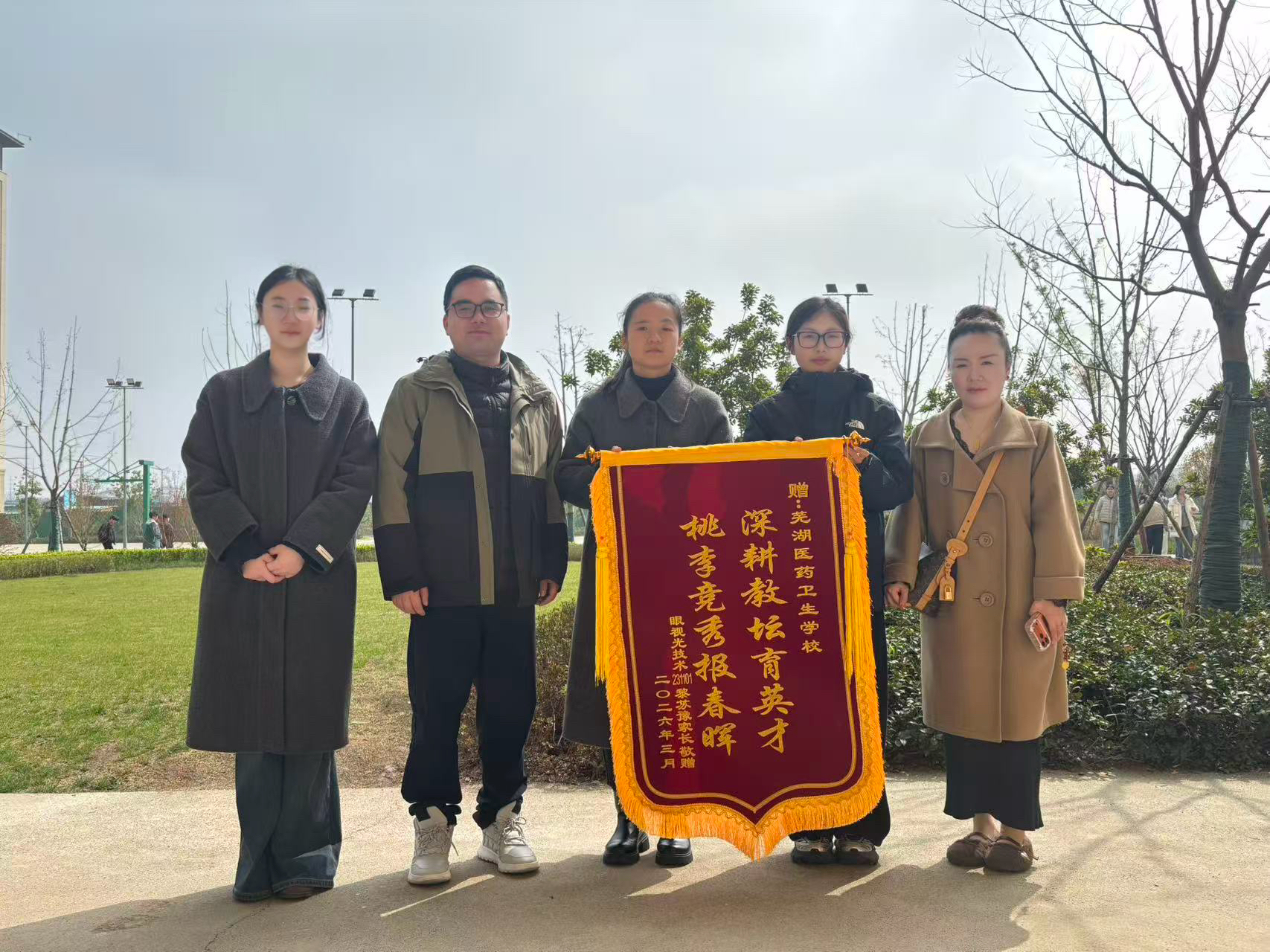 2025年世界职业院校技能大赛争夺赛中,系部学子奋勇争先斩获两项铜奖;获奖学子凭借赛事优异成绩,在2026年安徽省分类高考中成功获得理想院校免试资格。4月2日,眼视光231101班黎苏豫、中药230402班张馨语、中药230405班潘晓雪、康复230701班贾云哲四位同学,手捧鲜花与锦旗专程向老师们致谢,感恩备赛期间老师们夜以继日的辛勤付出与全程陪伴。