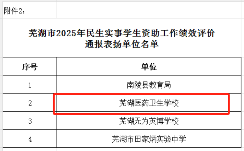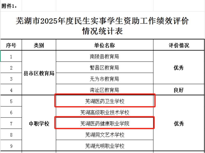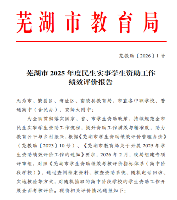 近日,芜湖市教育局公布了2025年度民生实事学生资助工作绩效评价检查结果,我校在2025年度全市民生实事学生资助工作绩效评价材料检查中,凭借扎实规范的工作、精准高效的落实和全面深入的育人成效,从众多参评学校中脱颖而出,荣获优秀等次,体现了学校在资助育人与教育民生保障领域的扎实工作得到上级主管部门的充分认可。